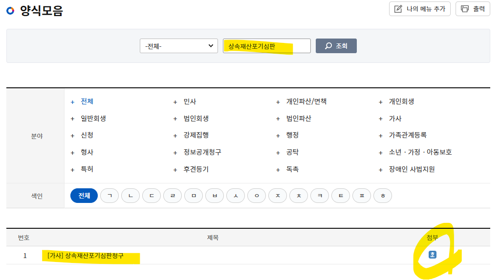 (4)상속재산포기심판청구를 클릭 후 한글파일을 다운로드합니다.
