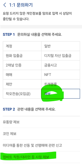 ① 더보기 → ②고객센터 → ③1:1문의하기 → ④제보 → ⑤업비트 직원 사칭제보