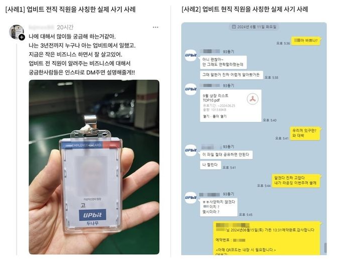 본인이 업비트에서 일했을 때의 사원증이라면서 특정 소셜미디어에 해당 사진을 게시하고, 불특정 다수에게 접근하여 본인이 운영한다는 사업을 홍보하고, 비즈니스에 관심이 있는 사람들을 끌어보아 그들을 대상으로 사기행각을 벌이고 있습니다.