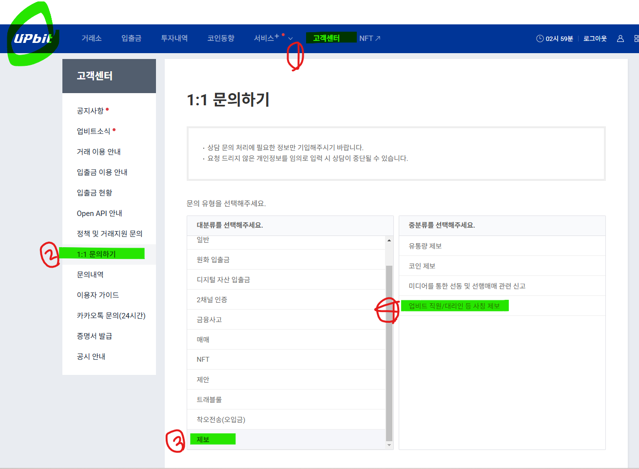 ① 고객센터 → ②1:1문의하기 → ③제보 → ④업비트 직원 사칭 제보